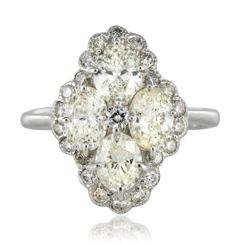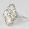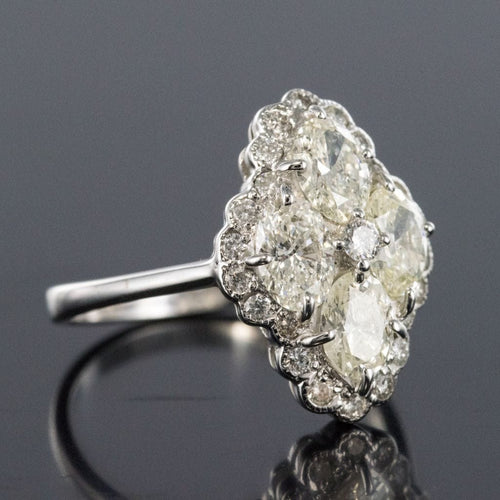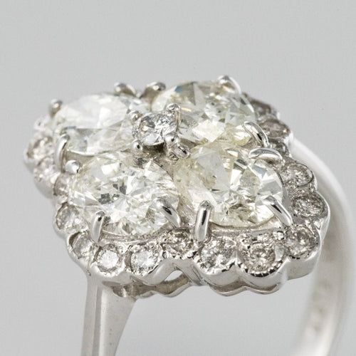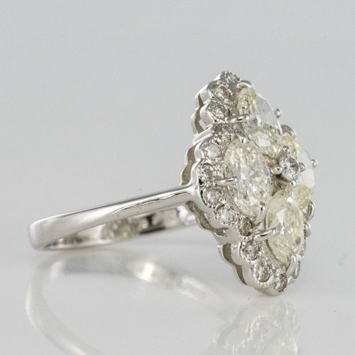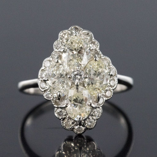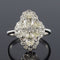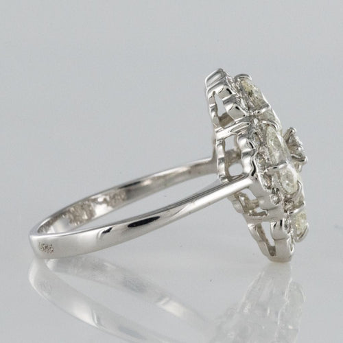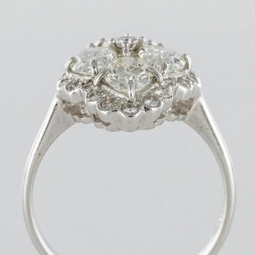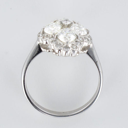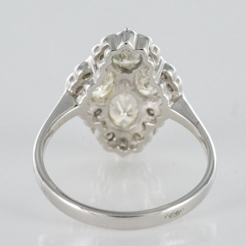 Ring in white gold, 750/1000th, 18 carats, eagle's head hallmark. In the shape of a marquise diamond ring, quadrilobed, this white gold diamond ring is set with 4 claws on its top with 4 oval diamonds, and a round diamond in the center. The entire rim is set with 22 brilliant-cut diamonds. The basket is openwork.