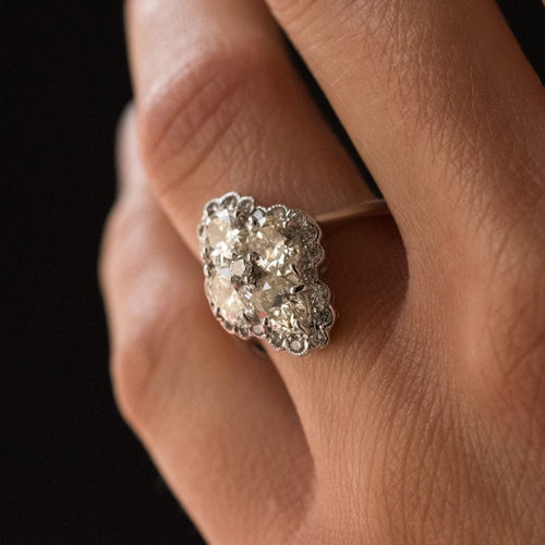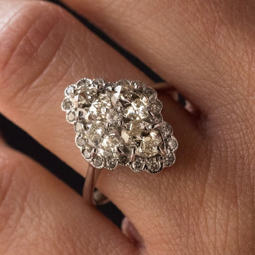 - Total weight of diamonds: approximately 2.05 carats - Estimated quality of diamonds: Surround and center: color G/H - clarity VS, for the 4 in the center: color I/J - clarity Si to Si1/2.