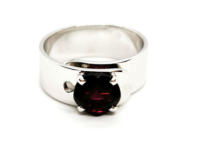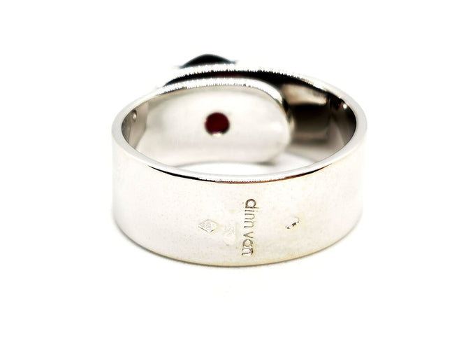 Ring branded of the House Dinh Van, Sistine collection, in 750 thousandths (18 carat) white gold, set with a round garnet, approximately 2.10 carats, Ring size : 54, width on top: 0.82 cm, height: 0.67 cm, total weight: 9.94 g, eagle's head hallmark, excellent condition.