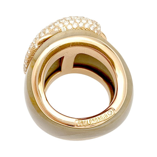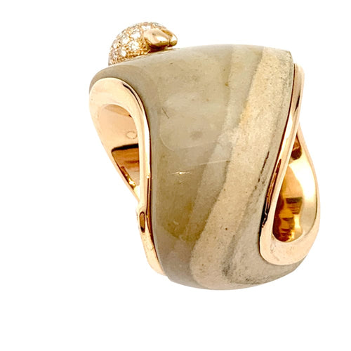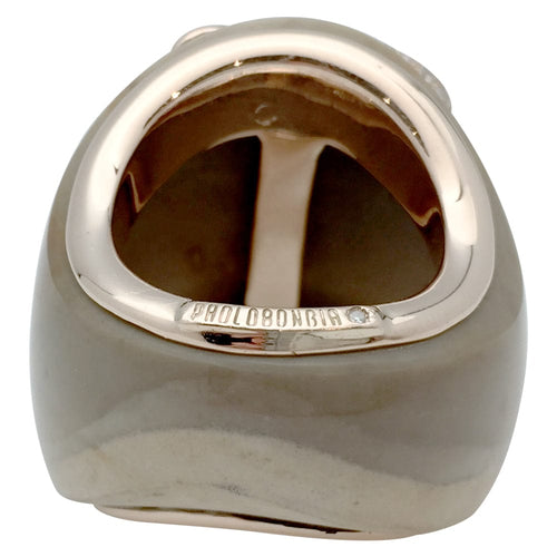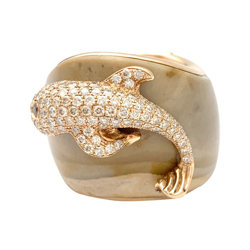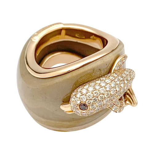 An important ring branded from the house of Paolobongia in 750/000 pink gold. The body of the ring is made of zoned jasper on which a pink gold dolphin stands out, entirely paved with brilliant-cut diamonds and garnet.