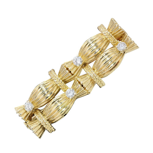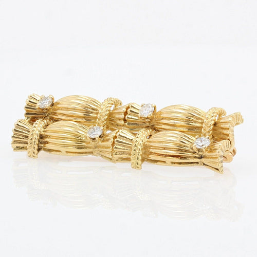 - Amazing vintage gold brooch, it forms 4 bundles held by braided links. Occasionally there are 4 brilliant-cut diamonds.