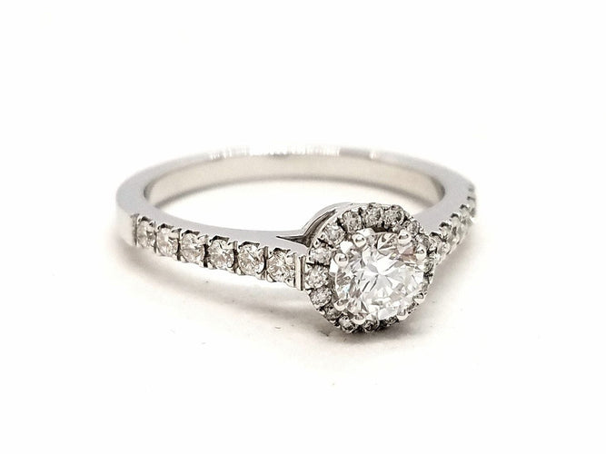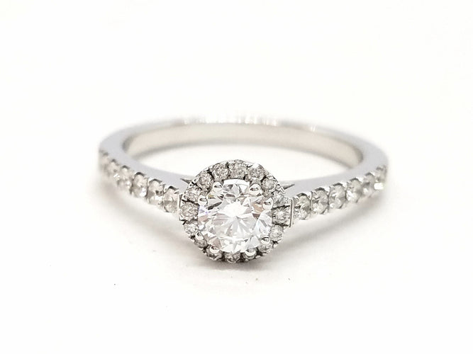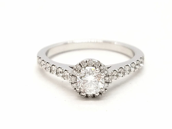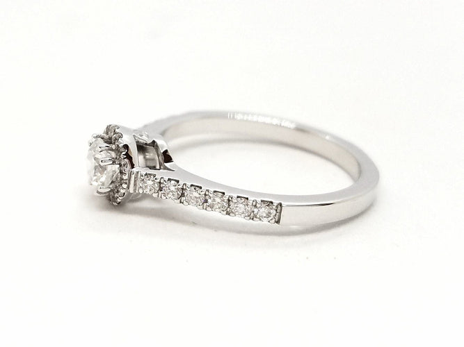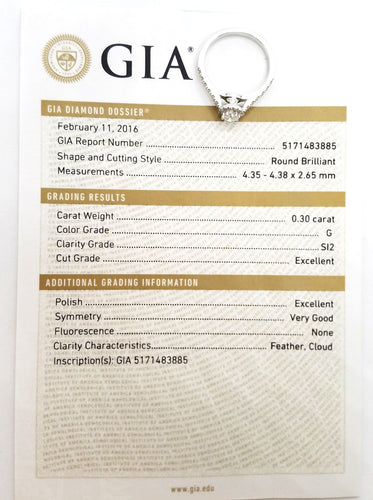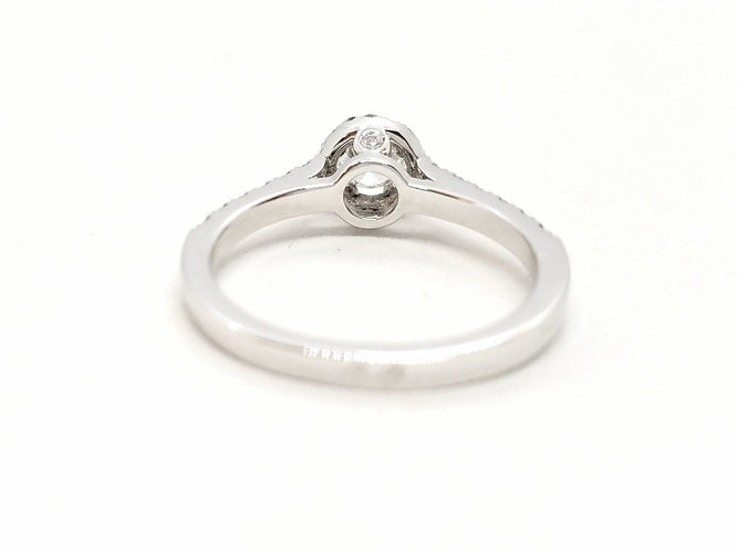 Solitaire in 750 thousandths (18 carat) white gold, set with diamonds for a total of 0.71 ct, including a brilliant-cut G-SI2 central diamond of 0.30 ct GIA certified, surrounded by 18 brilliant-cut diamonds including 2 on the sides of the setting for a total of 0.17 ct, and supported by 12 brilliant-cut diamonds for a total of 0.24 ct, Ring size: 53, diameter of the motif on the top: 0.66 cm, height: 0.62 cm, width of the ring: 0.19 cm, total weight: 3.10 g, eagle's head hallmark, new condition