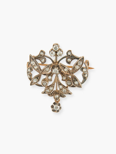 Foliage brooch in 18k gold and silver set with brilliant old-cut diamonds, one of which is held in a tassel.