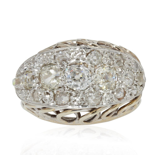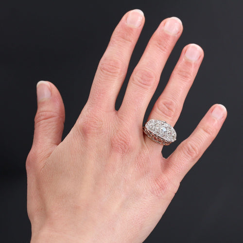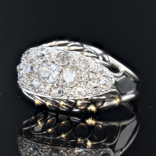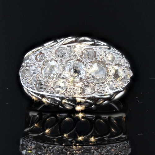 - Interesting dome ring, it is set on its top with a pavé of old-cut and rose-cut diamonds. The profiles of the frame are covered with openwork loops and on either side the start of the ring is formed by an arrowhead.