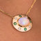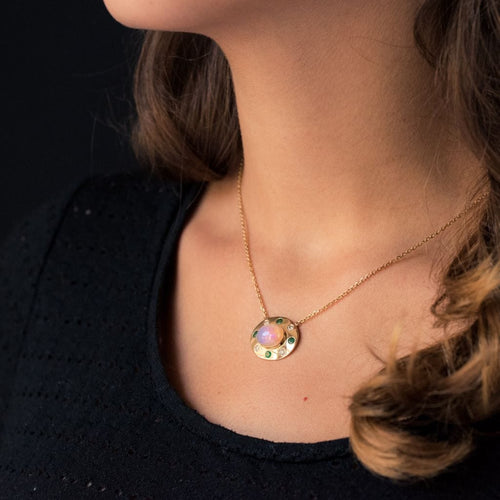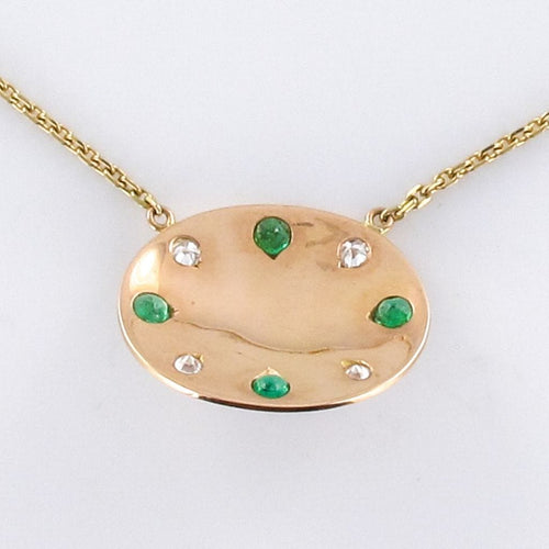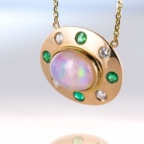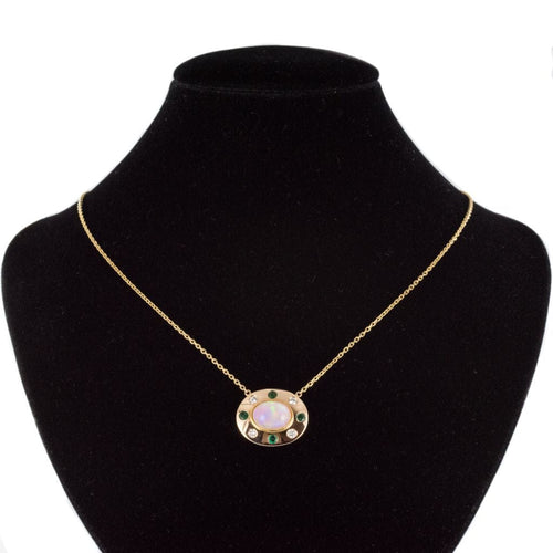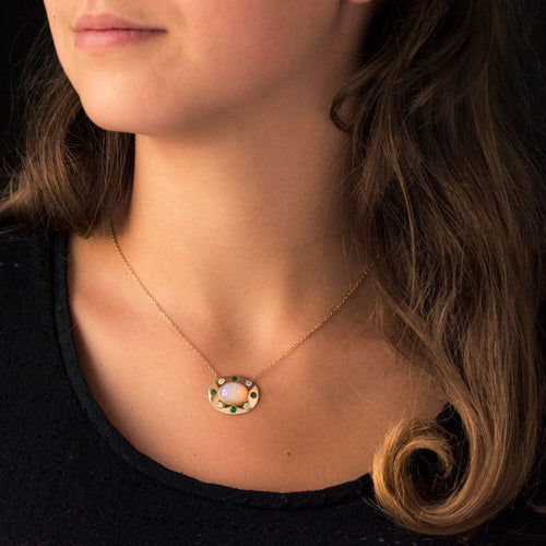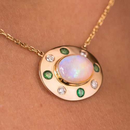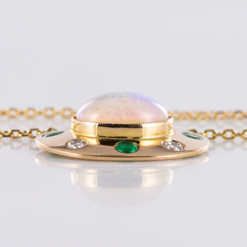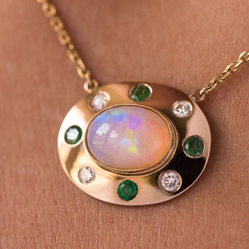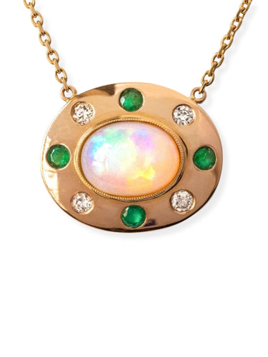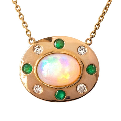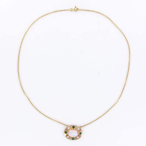 Creation Balm - Piunique era. Pendant in yellow gold, 750 thousandths, 18 carats, eagle's head hallmark. Oval in shape, this splendid and original necklace is adorned with a cabochon opal surrounded by alternating emeralds and brilliant-cut diamonds. The chain is a cable link with a spring ring.