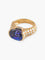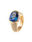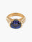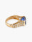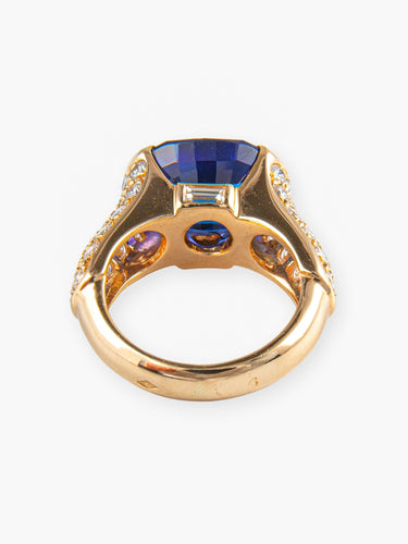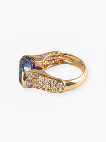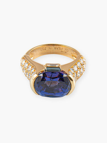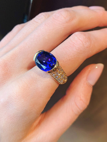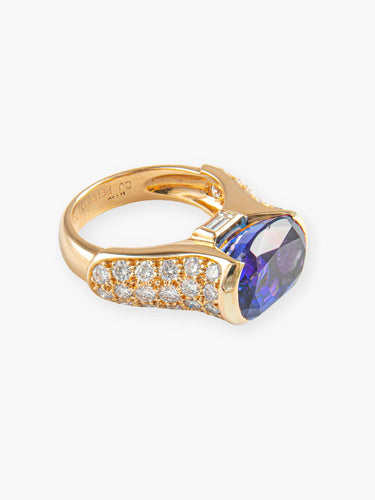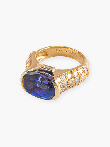 750 yellow gold ring adorned with a tanzanite of approximately 10ct, highlighted with two diamond paving.