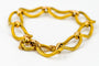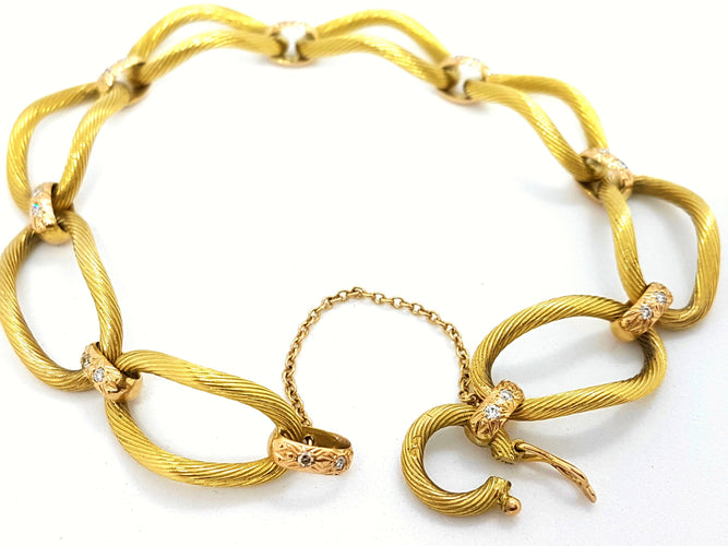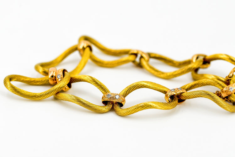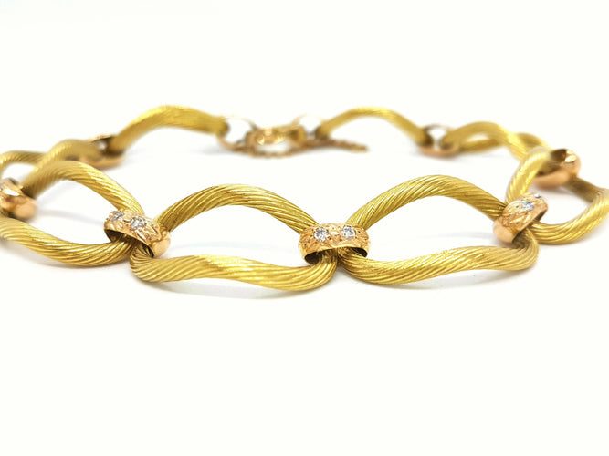 Sublime two-tone bracelet, In yellow gold and 750 thousandths (18 carat) pink gold, Hallmarked Wavy and chiseled links, Size: 19 cm, width: 1.2 cm, safety chain, Connected together by rose gold links studded with diamonds of approximately 0.18 carats, brilliant cut, GH, V-SI Total weight: 38 g, Excellent condition