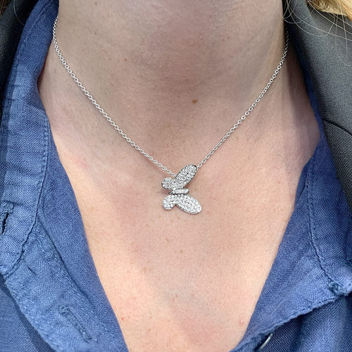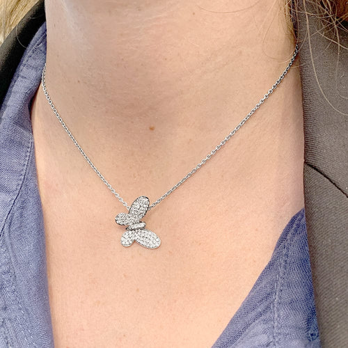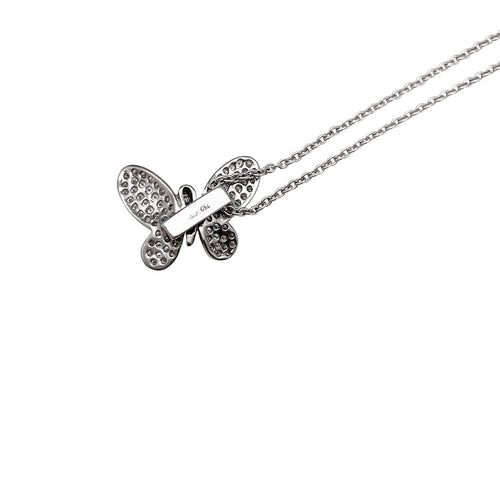 A 750/000 white gold pendant featuring a butterfly paved with brilliant-cut diamonds on a 750/000 white gold round convict link chain.
