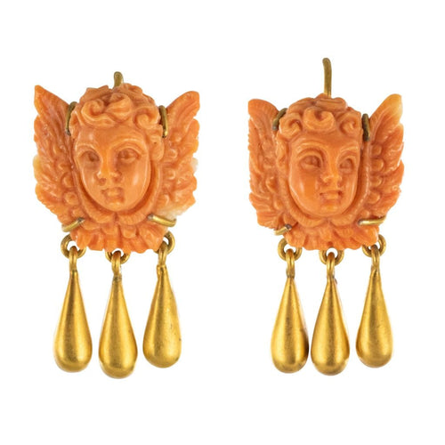 Gold earrings, 585 thousandths, 14 carats. These charming old earrings are made up of a cameo on coral representing a cherub which supports 3 gold drops in a tassel. The clasp is a swan's neck.