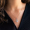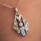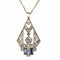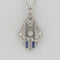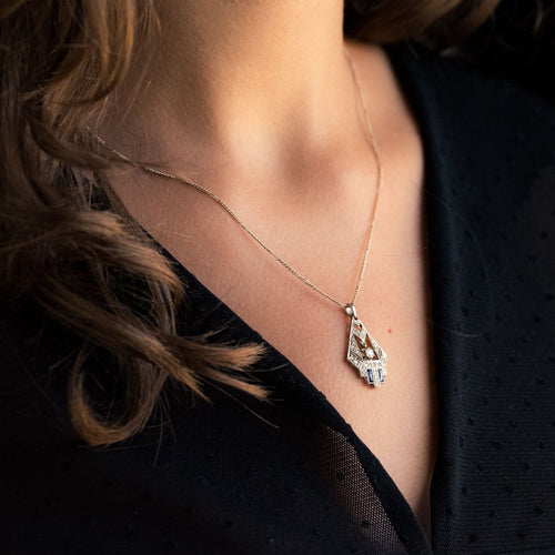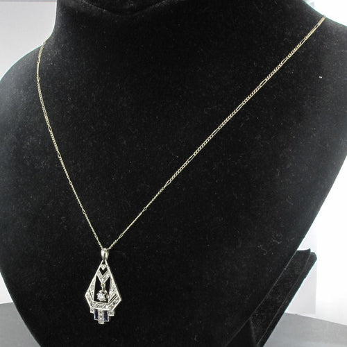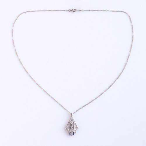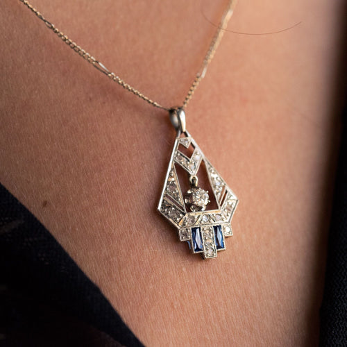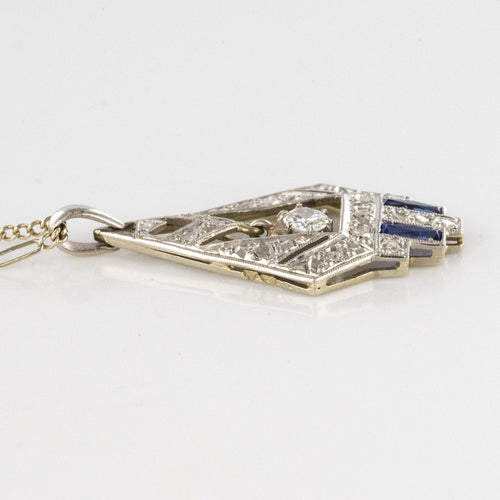 Pendant and its chain platinum and white gold, 750 thousandths, 18 carats, dog and eagle head hallmarks. This antique pendant is made up of an openwork geometric decoration dotted with small rose-cut diamonds and 2 calibrated synthetic sapphires. In the center of this pendant Art Deco There is a brilliant-cut diamond in a tassel. The chain is a fine curb chain interspersed with slightly longer patterns. The clasp is a spring ring.