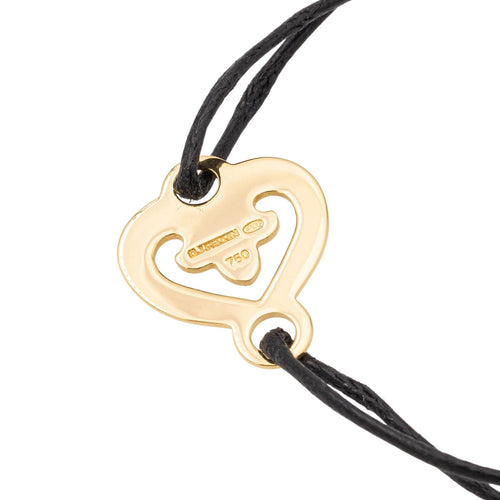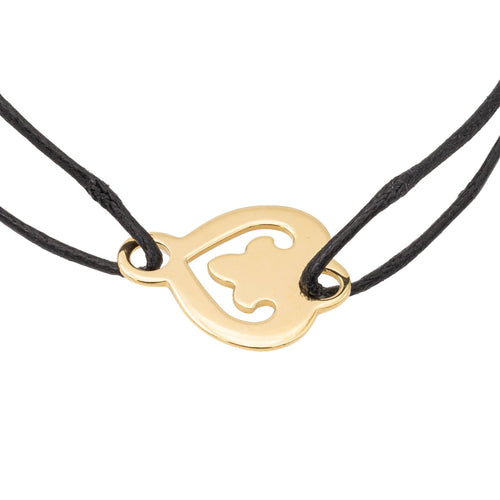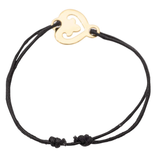 Bracelet branded from Maison OJ Perrin, heart in tested 750 thousandths (18 carat) yellow gold, legends model, black cord, max cord length: 27 cm, min cord length: 15 cm, pattern dimension: 1.7 cm x 1.5 cm , , adjustable size thanks to the sliding knots of the cord, total weight: 1.77 g, excellent condition
