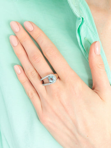 18-carat white gold ring holding an aquamarine in its center in an surround entirely paved with diamonds.