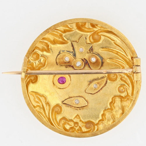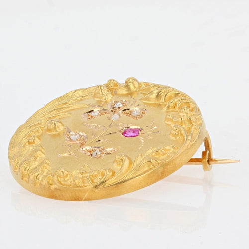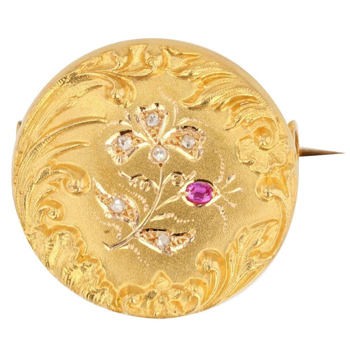 - Lovely old brooch in a round shape, it is decorated with delicately chiselled floral motifs and set with rose-cut diamonds and a small ruby. The clasp is a pin with safety clip.