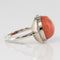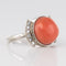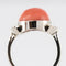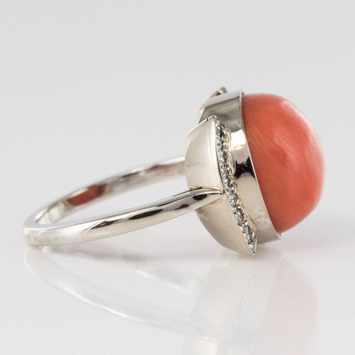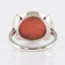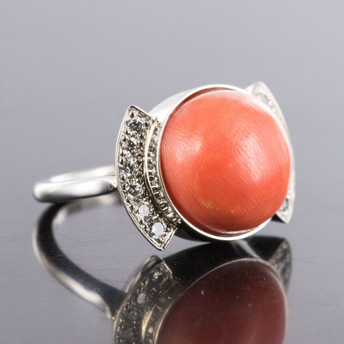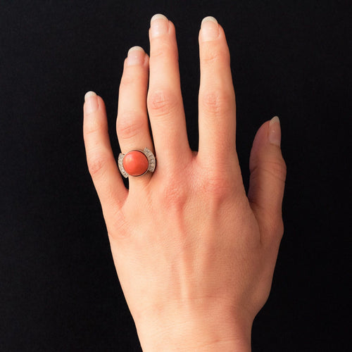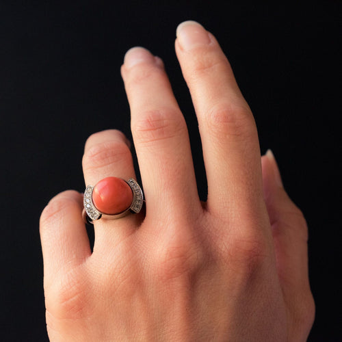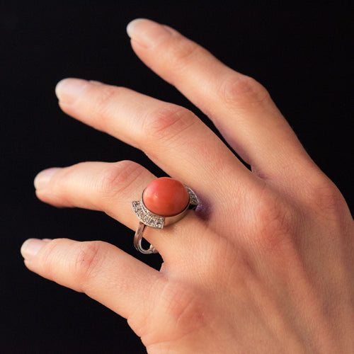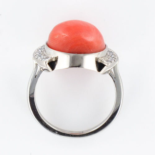 Ring in white gold, 750 thousandths, 18 carats, eagle's head hallmark. It is set closed on its top with a coral cabochon supported on either side by 2 wings set with brilliant-cut diamonds.