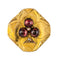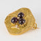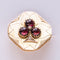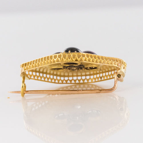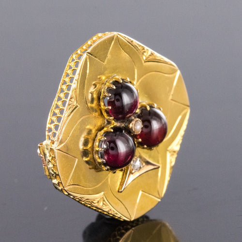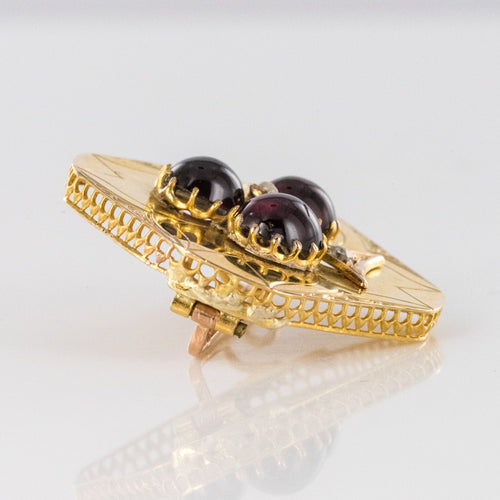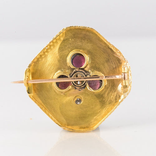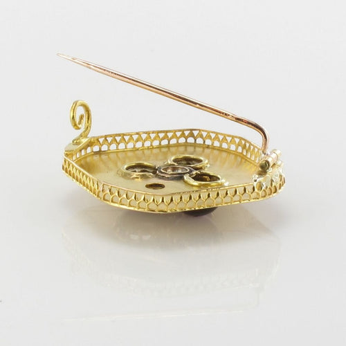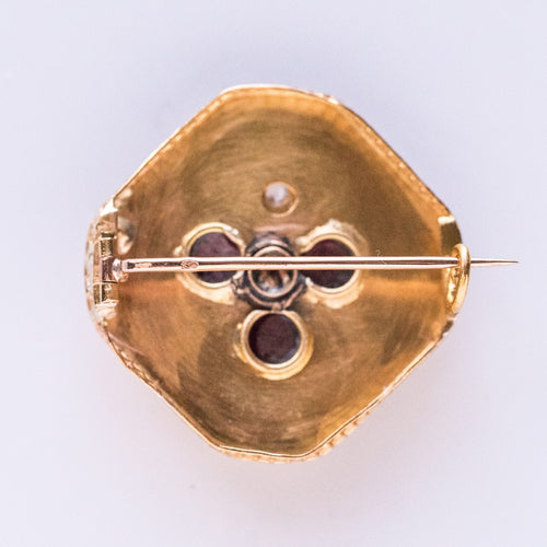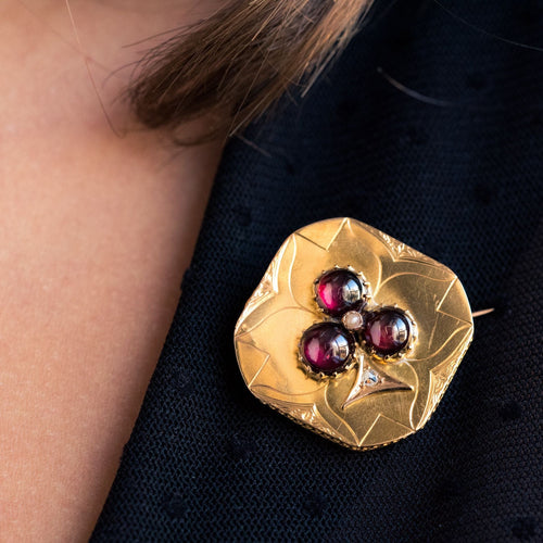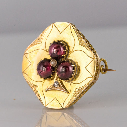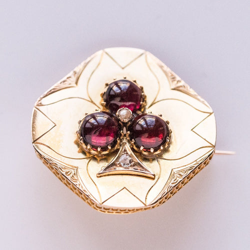 - Diamond-shaped, this lovely brooch is applique set on a gold plate delicately engraved with a decoration representing a 3-leaf clover whose leaves are 3 prong-set cabochon garnets centered with a fine half pearl also prong-set. and the tail an applied decoration set with a rose-cut diamond.