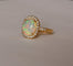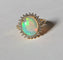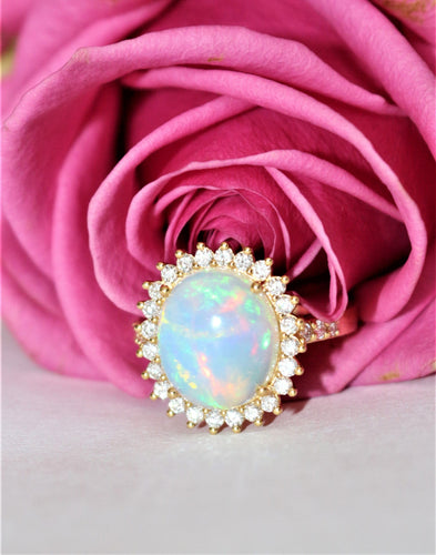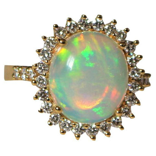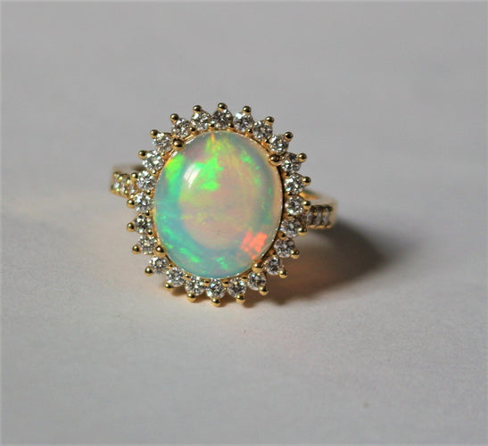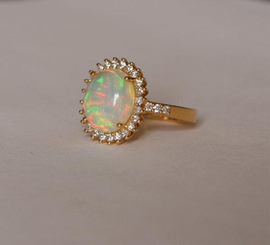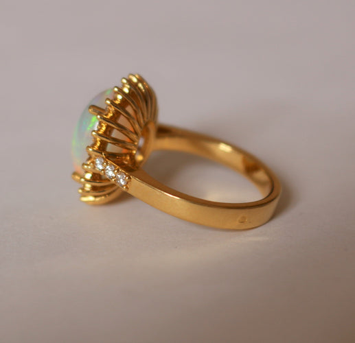 Pompadour ring in 18k (750) yellow gold centered with an Ethiopian opal surrounded and supported by 30 brilliant-cut diamonds, approximately 0.30 carat in total