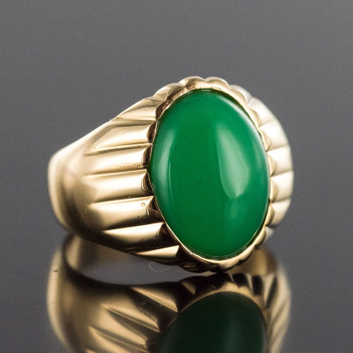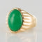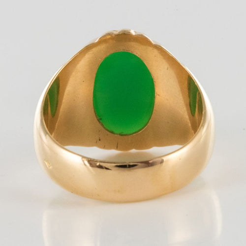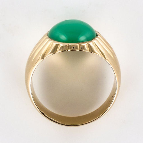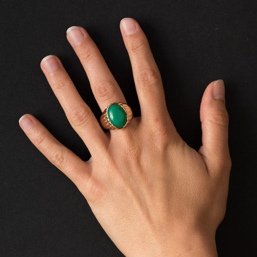 Yellow gold ring, 750 thousandths, 18 carats. In the shape of a signet ring, this vintage ring is adorned with an oval chrysoprase, surrounded by gadroons.