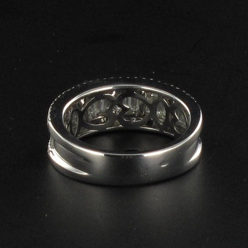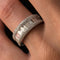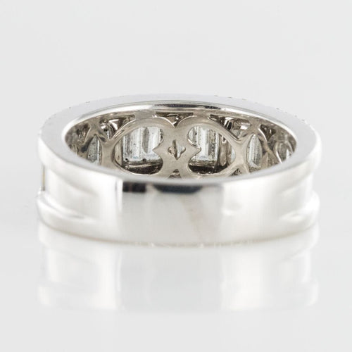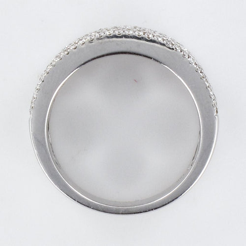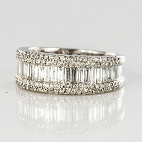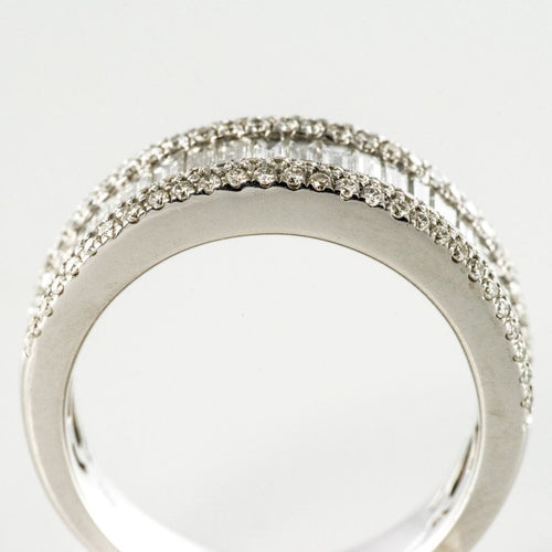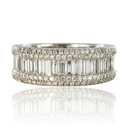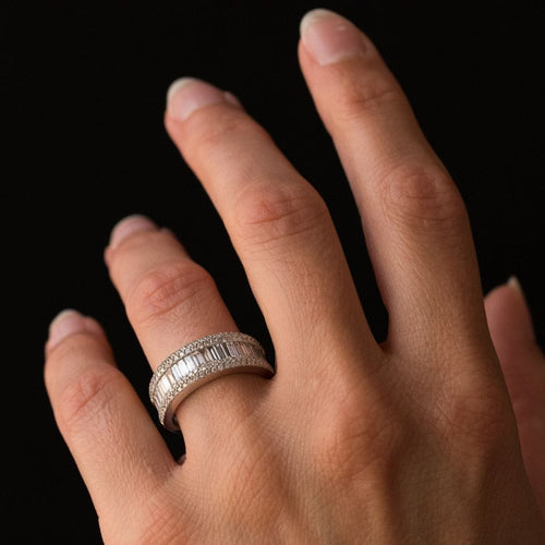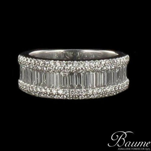 Ring in white gold, 750/1000th, 18 carats, eagle's head hallmark. It is set with 22 baguette diamonds which are highlighted on the top and on the bottom with 110 pavé diamonds on half of the ring.
