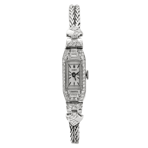 Superb white gold wristwatch in style Art Deco, adorned with diamonds that highlight its geometric and elegant design. This rare piece combines the timeless aesthetics of theArt Deco with refined luxury, ideal for those looking for an accessory that is both sophisticated and daring.