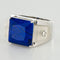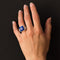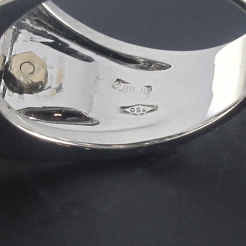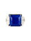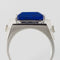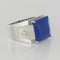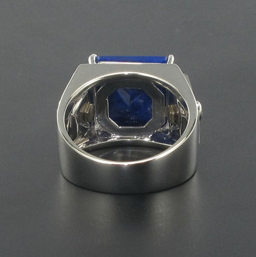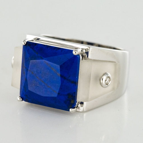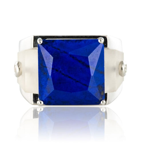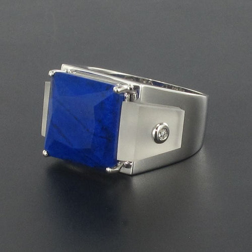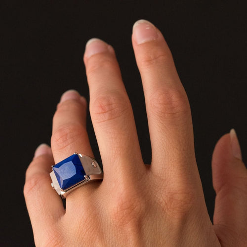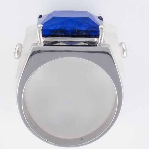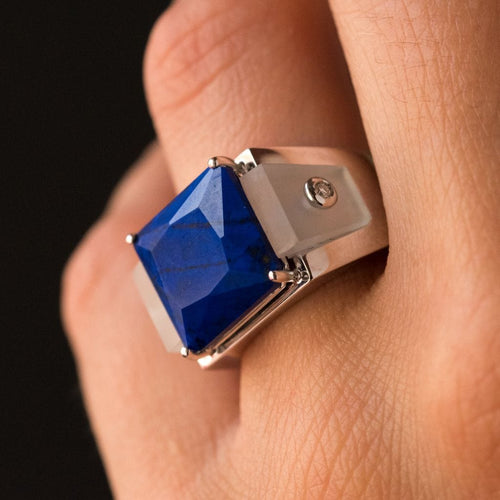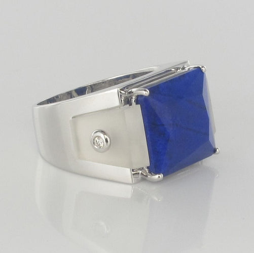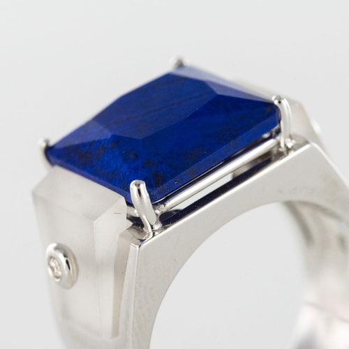 - White gold ring with geometric lines, it is set on its top with a faceted lapis lazuli supported on either side by a rock crystal which follows the contours of the plate set closed in the center with a brilliant-cut diamond.