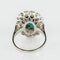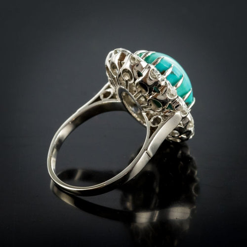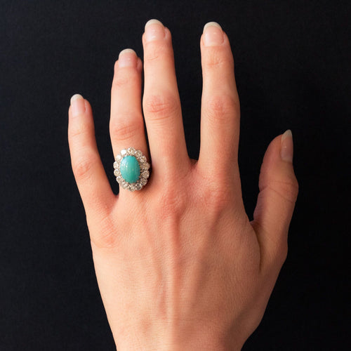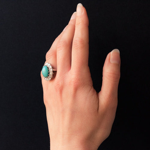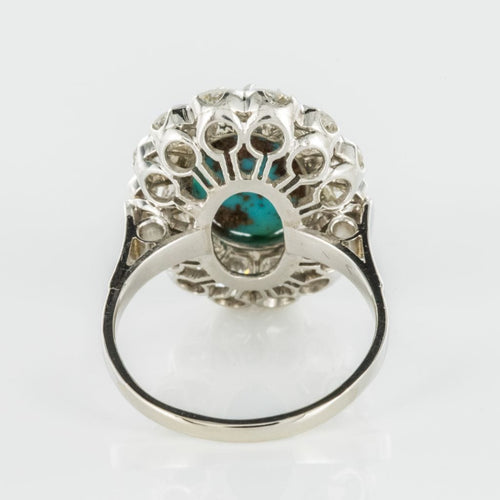 Ring in white gold, 750 thousandths, 18 carats, owl hallmark and platinum, mascaron punch. Important ring Daisy, it is prong-set in its center with a turquoise cabochon in a surround of 14 brilliant-cut diamonds. The basket is openwork to let the light penetrate under the gems.