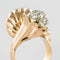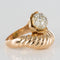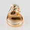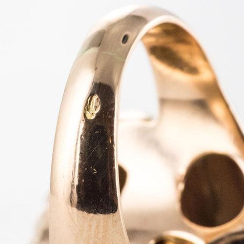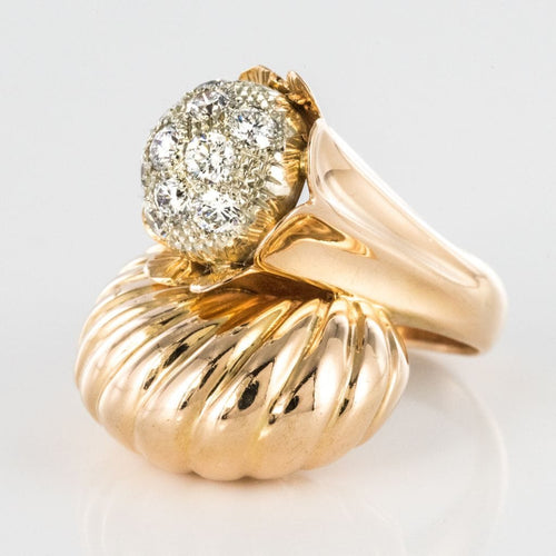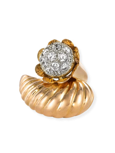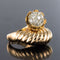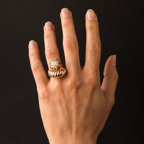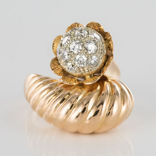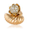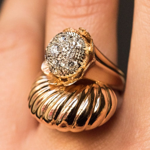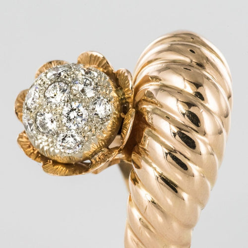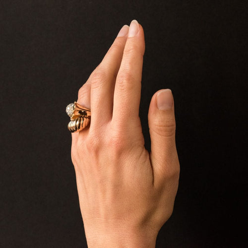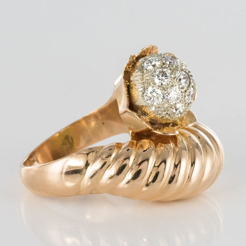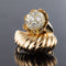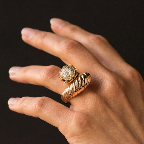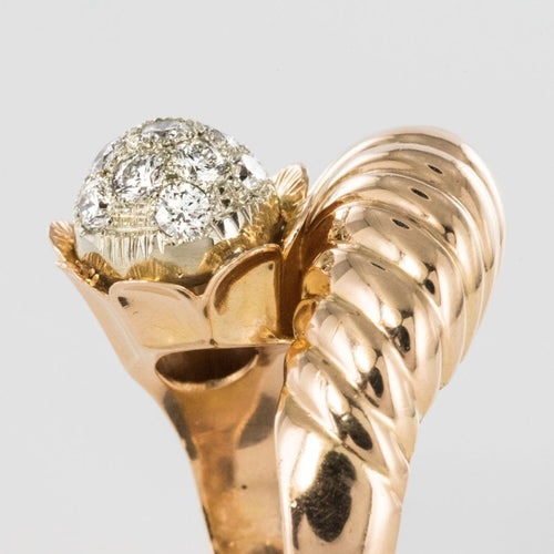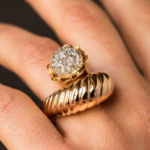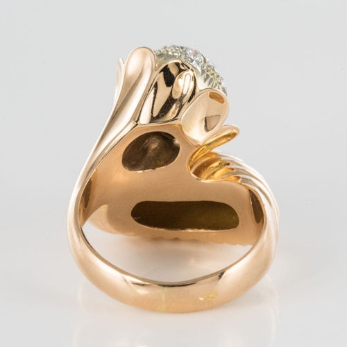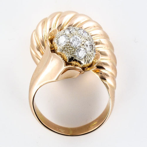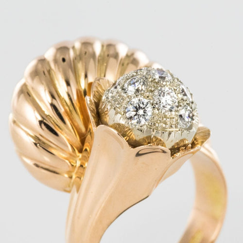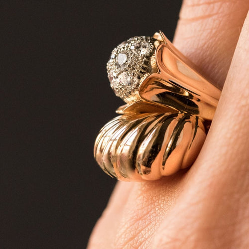 Ring in 750 thousandths, 18 carat yellow gold, owl hallmark. Asymmetrical on the top, this voluminous ring is made up of a domed motif with gadroons, attached to a flower whose heart represents a dome set with brilliant-cut diamonds.
