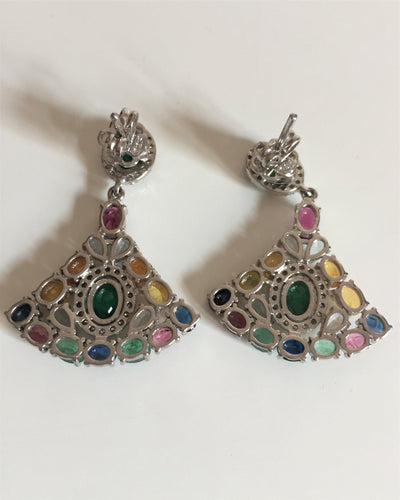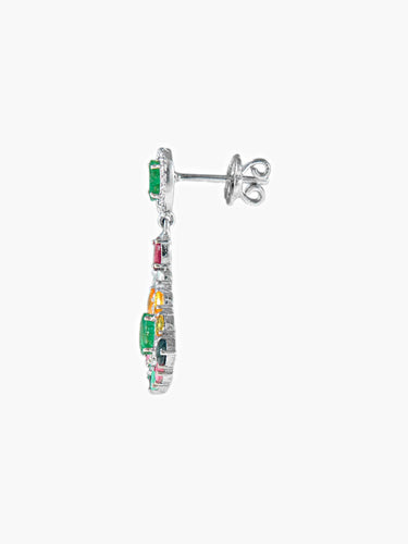Pair of pendant earrings in silver 925/°° fan-shaped, centered with an emerald in a surround of brilliants and claw-set with colored sapphires and aquamarines. In very good condition.