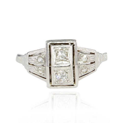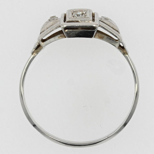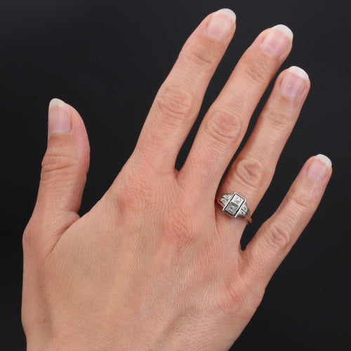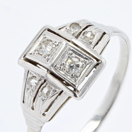 All in simplicity, this ring Art Deco is set on its top with 2 old-cut diamonds on a geometric and openwork decoration.