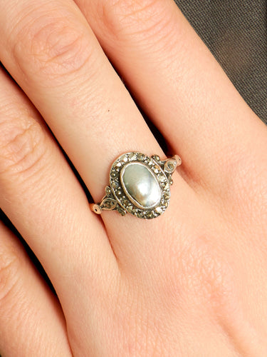 Old ring in 750/1000 yellow gold and silver solid 800/1000 Charles X Restoration style, set with gray mother-of-pearl on silver surrounded by marcasites. The forked shoulder is set with marcasites.