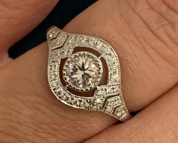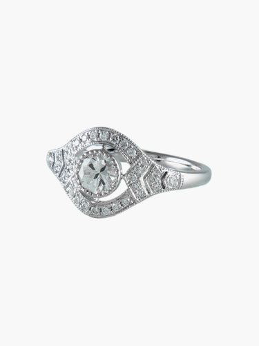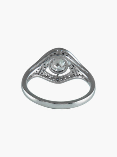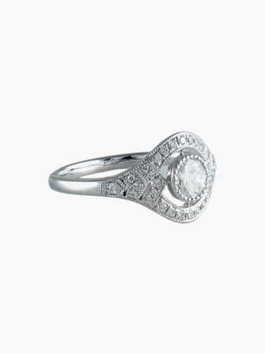 18 ct white gold ring set with a central diamond of 0.43 ct surrounded by a pavé of brilliants totaling 0.17 ct.