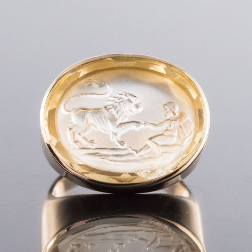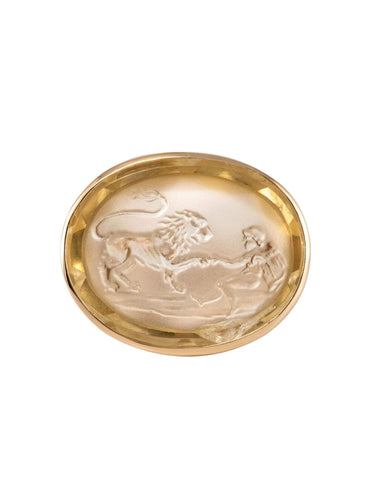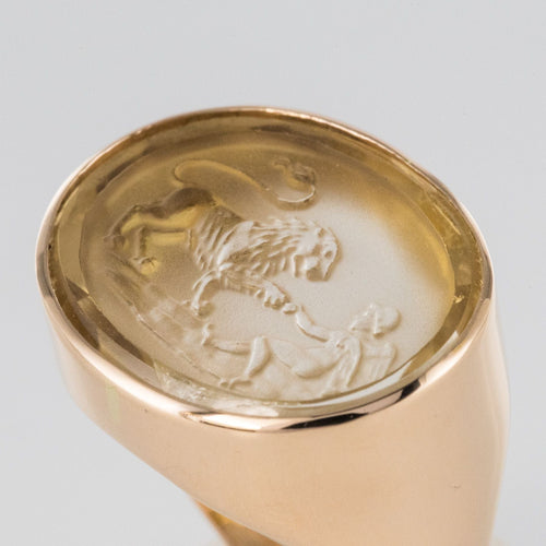 - The history of this jewel: This intaglio represents Saint Jerome and the Lion. The story goes that the saint was praying when he saw a lion, a ferocious predator, coming. Seeing the beast approach, Jérôme noticed that it was limping and crying. A huge splinter was stuck in his paw. He took it away and took care of the animal. It is said that the grateful lion never left Jerome again until his death, joining him there shortly after. Saint Jerome was canonized and became the patron saint of translators.