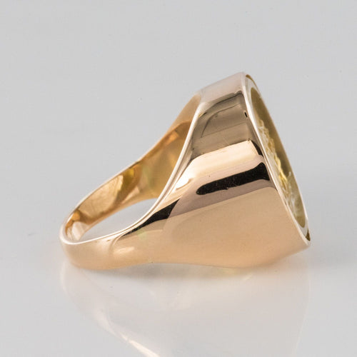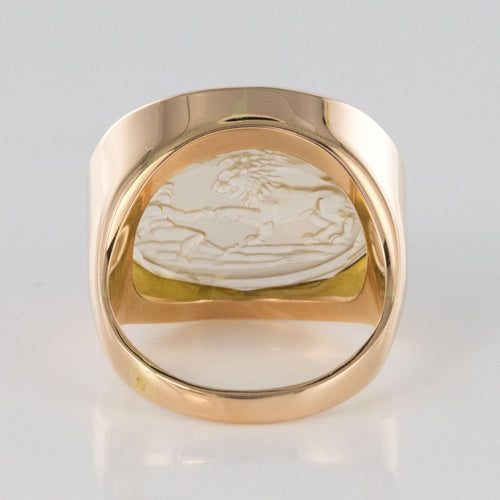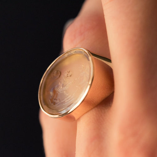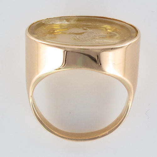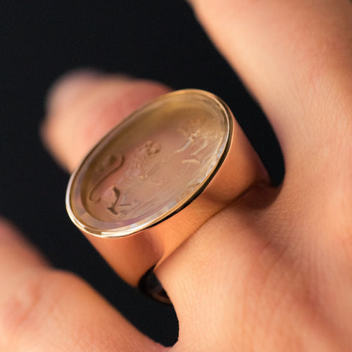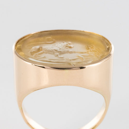 Ring in pink gold, 750 thousandths, 18 carats, eagle's head hallmark. Magnificent contemporary ring, it is set on its setting with an intaglio on quartz representing a mythological scene.