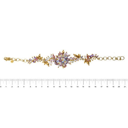 Bracciale in 18kt gold with central flower smaltato a mano con la tecnica dello smalto a fuoco, impreziosito da due star in gold bianco con 2 diamondi taglio Brilliant da 0.01 ct cad. and contornato da pendant in gold, pearl and pietre colored (tormaline, ametist and quartz). Brand: Gabriella Rivalta