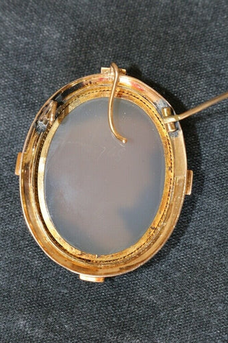 THE cameo is mounted as a brooch with a 750 (18ct) yellow and pink gold setting, enhanced with 4 small fine pearls. 750 hallmark on the pin and eagle head on the top hook