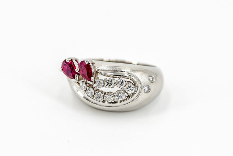 Ring in platinum and 750 thousandths (18 carat) white gold, set with 2 pear-cut rubies of approximately 0.40 carat and 9 diamonds (between 1.8 mm and 1.9 mm in diameter) brilliant cut, GH color, V- purity SI, for approximately 0.25 carat in total. Total weight: 9.40 g, Finger size: 51, Dog head and eagle head hallmarks, Excellent condition