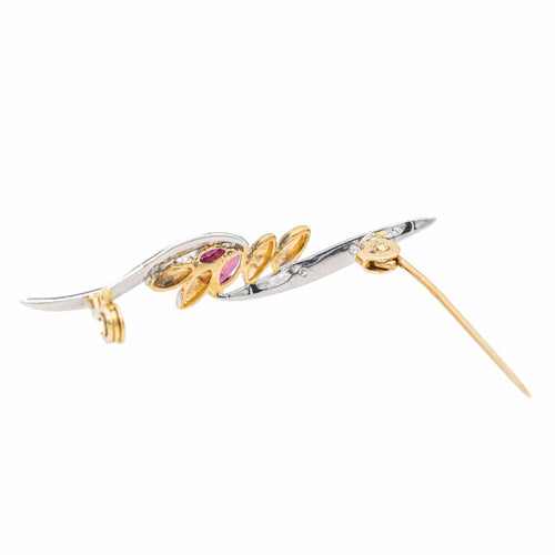 Brooch in 750 thousandths (18 carat) yellow gold, set with rubies and diamonds, 2 marquise-cut rubies, with a total weight of approximately 0.20 ct, (each ruby with a weight of approximately 0.13 ct and 0.07 ct), surrounded by 4 eight/eight-cut diamonds, approximately H-SI, with a total weight of approximately 0.02 ct, (each diamond with a weight of approximately 0.005 ct), dimensions: 3.90 cm x 0.58 cm, total weight: 2.10 g, eagle's head hallmark, excellent condition