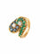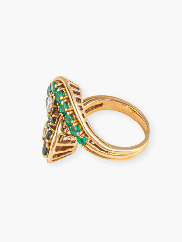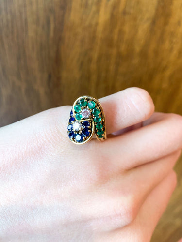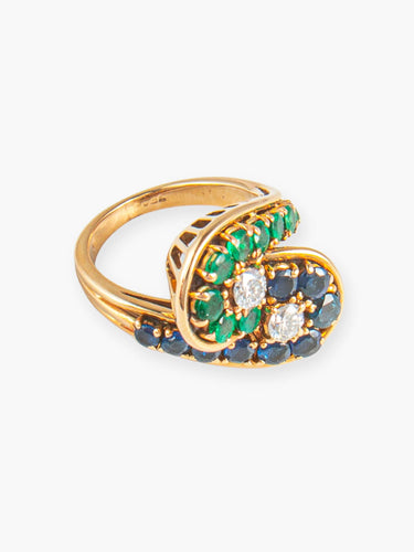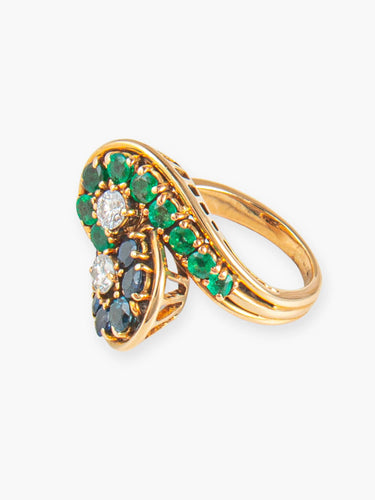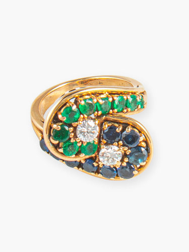 Vibrant ring in 750 yellow gold, paved with sapphires, emeralds and diamonds.