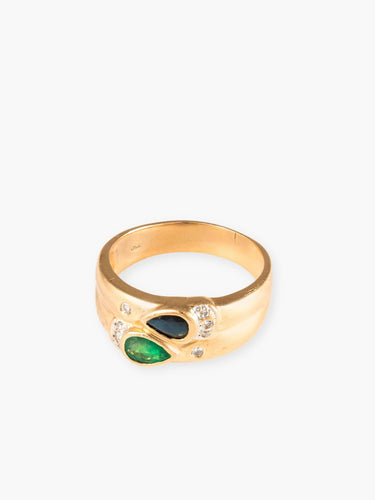 Double ring in 750 yellow gold adorned with a sapphire and a pear-shaped emerald, all enhanced with diamonds.