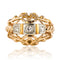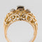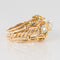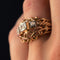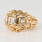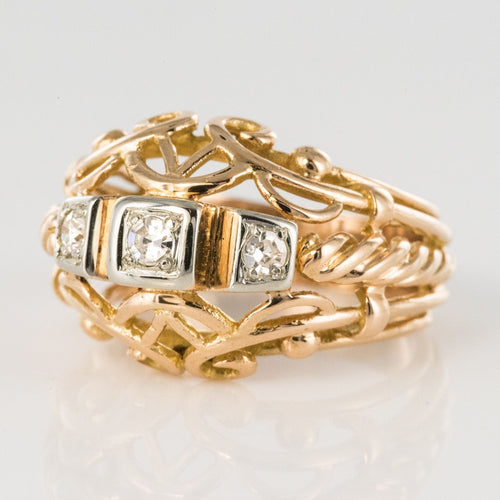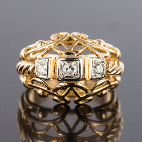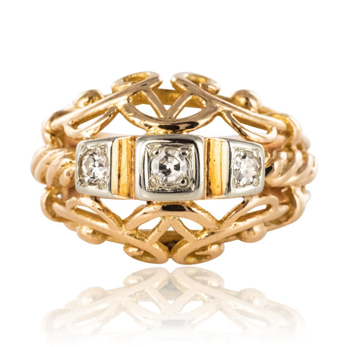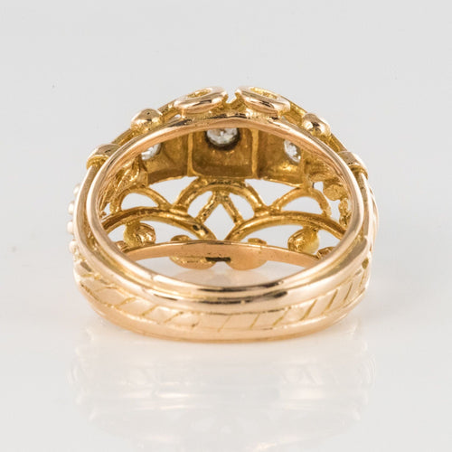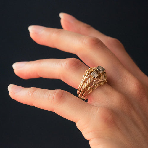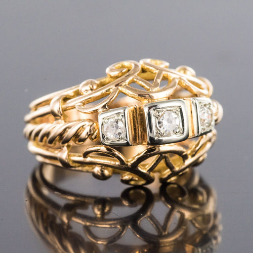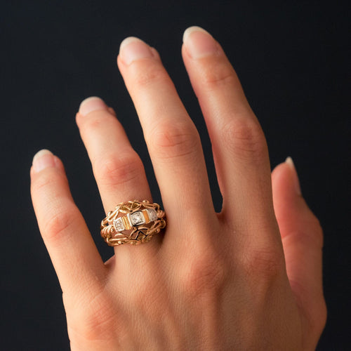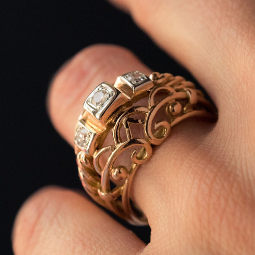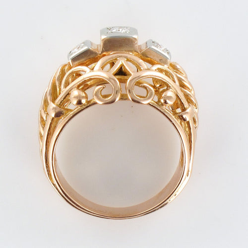 Ring in pink gold, 750 thousandths, 18 carats. This splendid antique dome-shaped ring is made of smooth, twisted and wound gold wires. On the top, 3 diamonds are set within a geometric decoration.