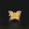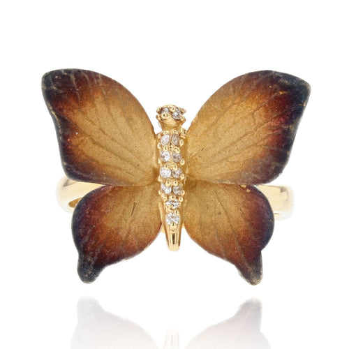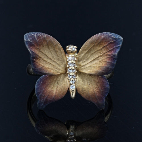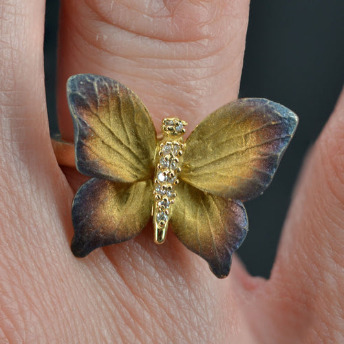Ring in 750 thousandths, 18 carat yellow gold. It forms a butterfly in flight whose wings are a slightly glittery enamel from yellow in the center to pink and blue towards the edges. The insect's entire body is paved with diamonds.