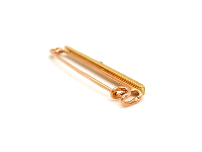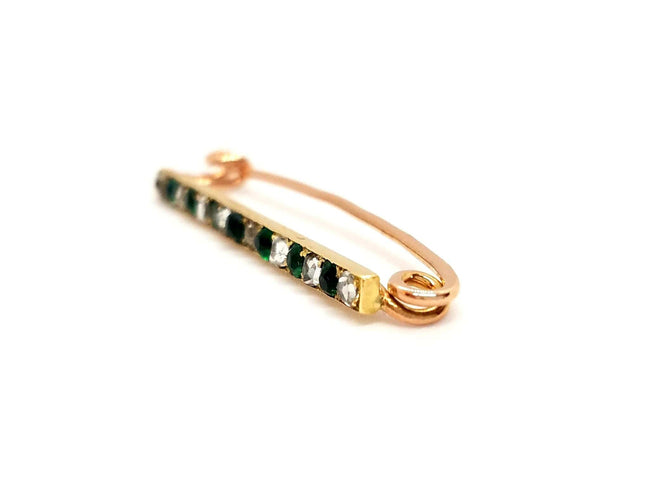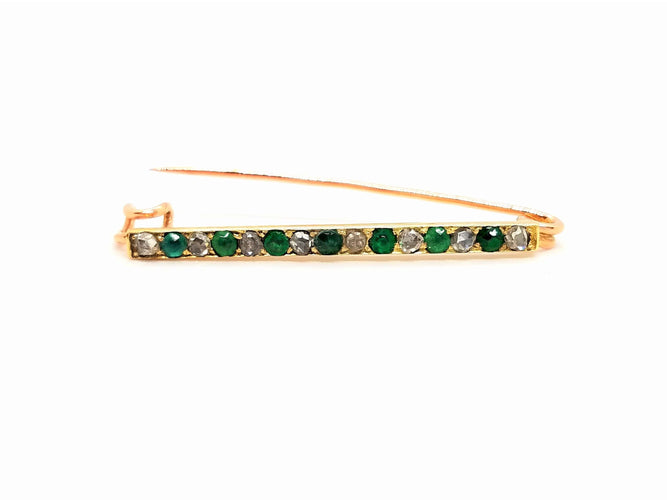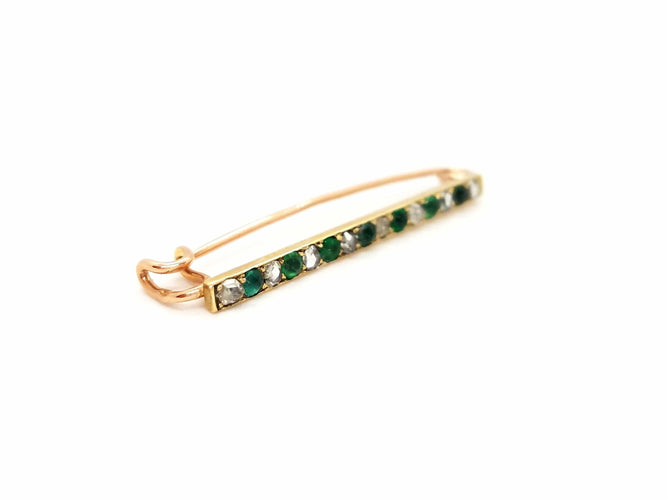 Pin Art Deco, in 750 thousandths (18 carat) gold, bar in yellow gold and stem in pink gold, set with 8 old-cut I-SI diamonds for approximately 0.28 ct in total and 7 round emeralds for approximately 0.24 ct in total , barrette dimensions: 3.46 xm x 2.5 cm, total length: 3.93 cm, eagle head hallmark, total weight: 2.35 g, excellent condition