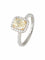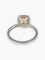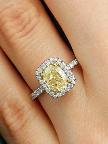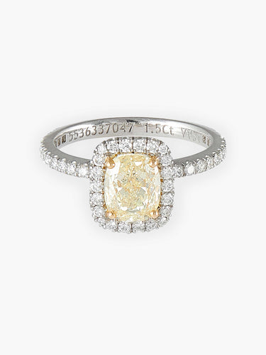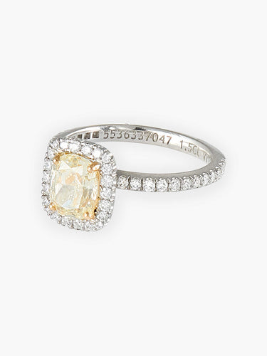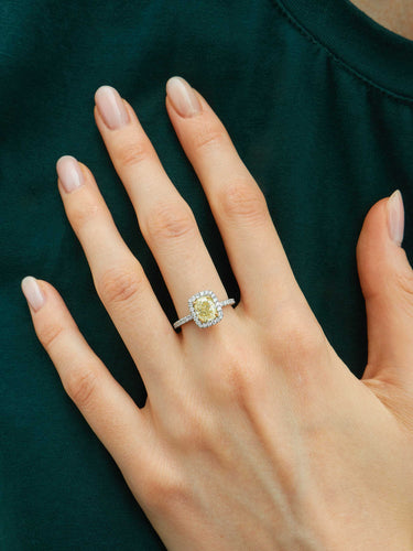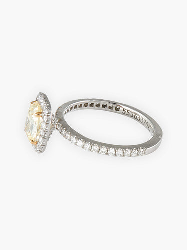 White gold ring and platinum adorned with a Fancy color diamond surrounded by white diamonds. The body of the ring is a line of diamonds.