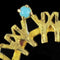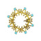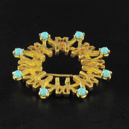 Brooch in yellow gold, 750 thousandths, 18 carats. Round in shape, it represents the sign of the 1967 Universal Exhibition in Montreal which is set with 8 turquoise imitation porcelain cabochons. The clasp is a pin with safety pump.