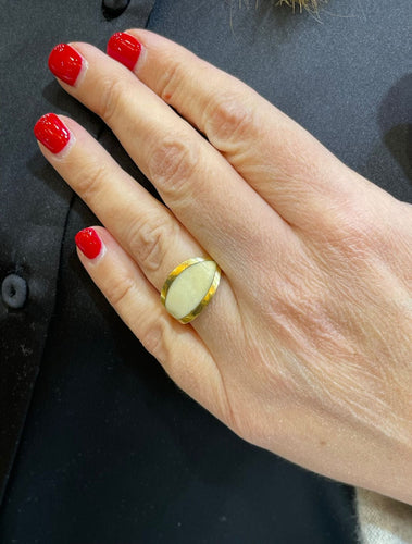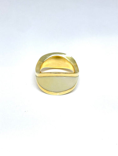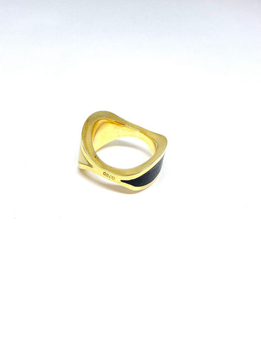 Ring in 18-carat 750/1000 yellow gold branded Puig Doria in an original shape, decorated with wood and ivory.