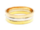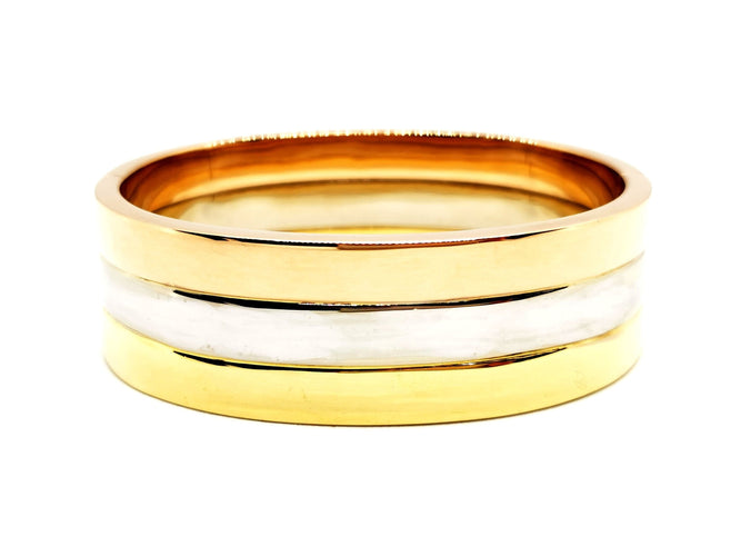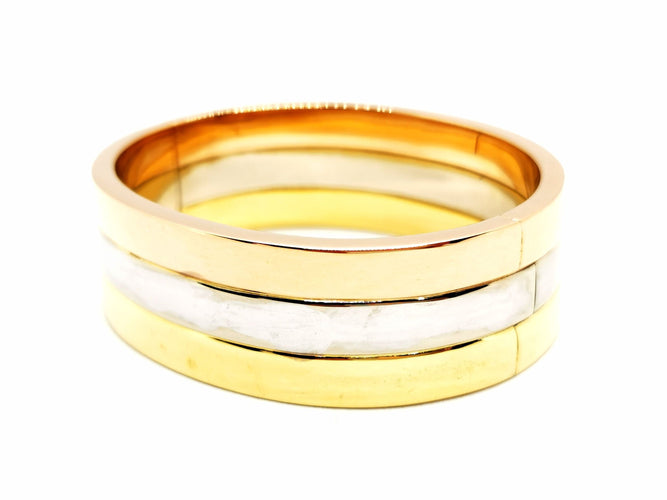 Rigid cuff bracelet, branded of the House Fred, in 750 thousandths (18 carat) gold, rose gold, yellow gold and white gold, oval shape, size: 17.5 cm, width: 2.03 cm, thickness: 0.35 cm, interior diameter: 5.8 cm x 4.8 cm, total weight: 65.45 g, owl hallmark, excellent condition