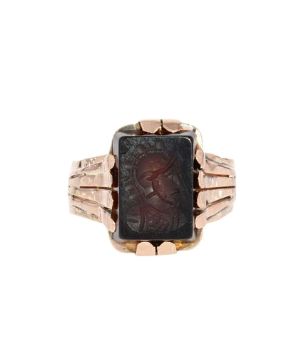 - Old ring, it is decorated with an intaglio on agate representing a helmeted man. It is held on all sides by pallets.
