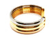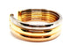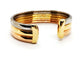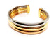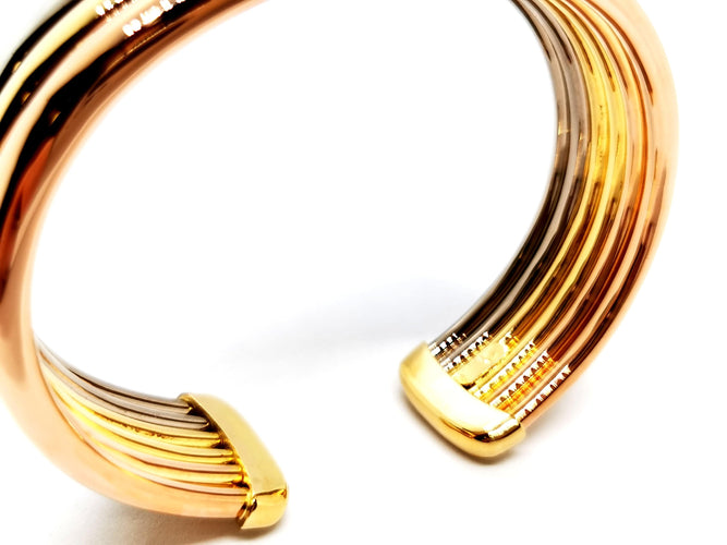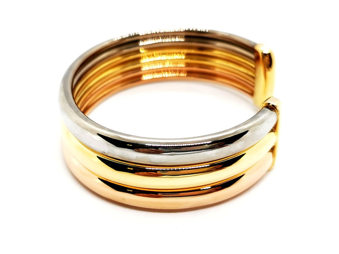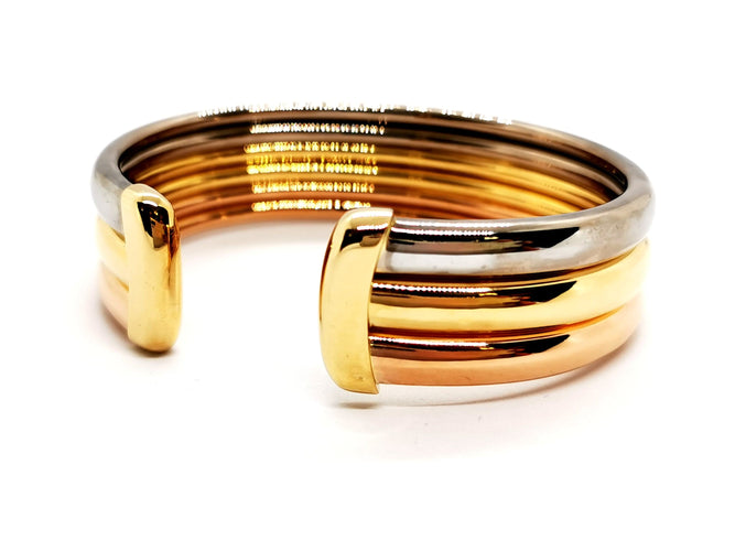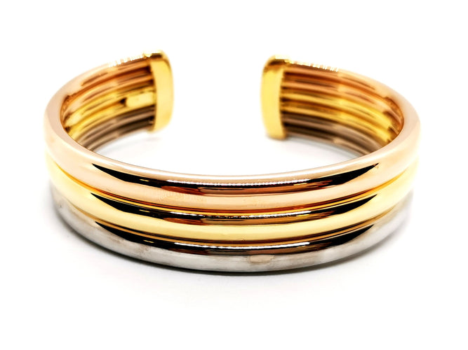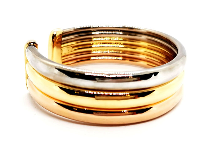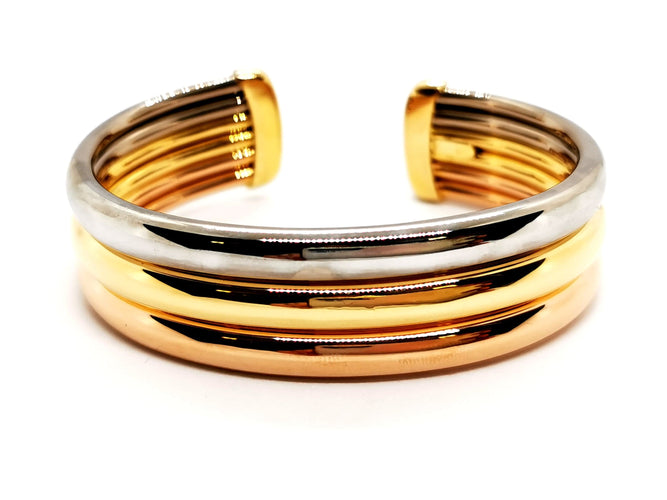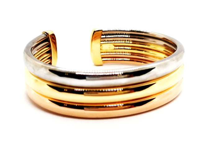 Rigid open bracelet, tricolor, in 750 thousandths (18 carat) gold, pink gold, yellow gold, and white gold, interior diameter: 6.2 cm x 5.1 cm, wrist size: 18.5 cm, width: 1. 76 cm, thickness: 0.4 cm, total weight: 41.76 g, owl hallmark, excellent condition
