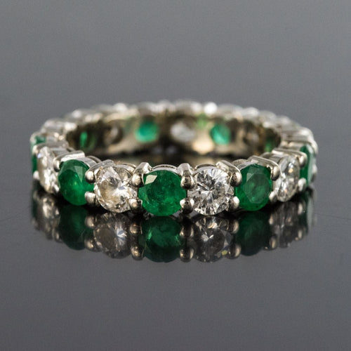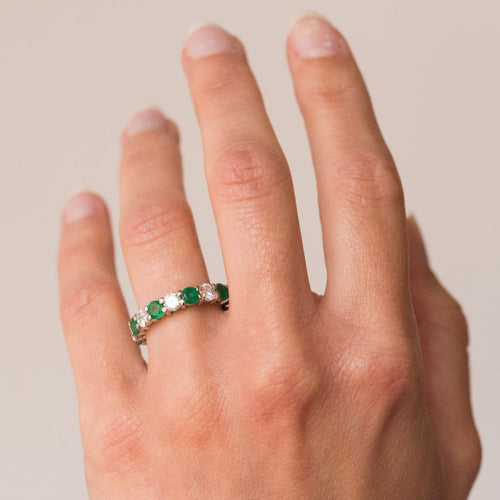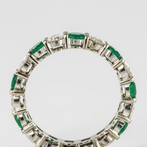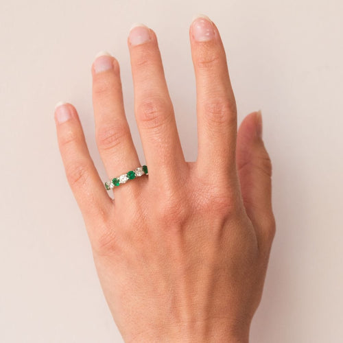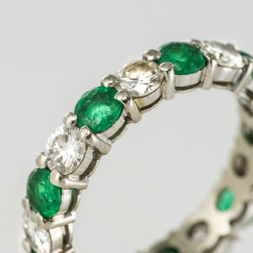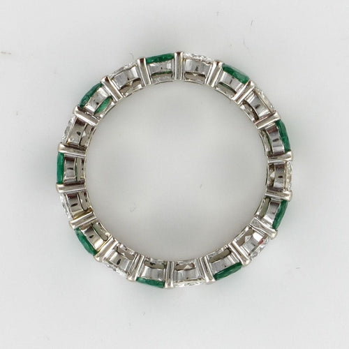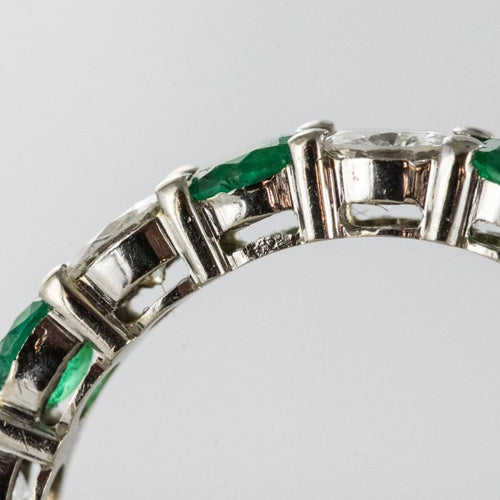 Wedding ring in 18 carat 750 thousandths white gold. This splendid white gold wedding ring is made up of alternating brilliant-cut diamonds and round prong-set emeralds.