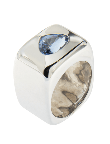 A modernist 18k white gold ring set with a heart-shaped natural sapphire.