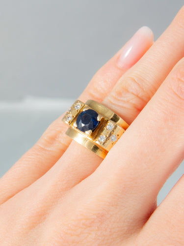 750/1000th yellow gold ring adorned with a round sapphire enhanced with diamonds.